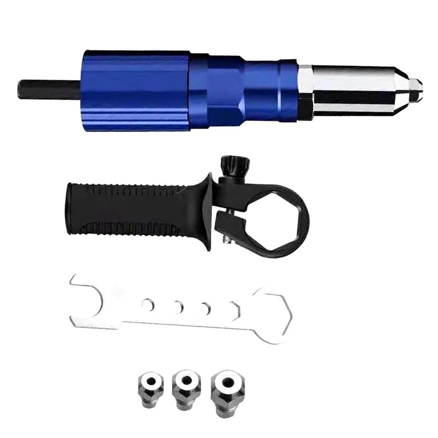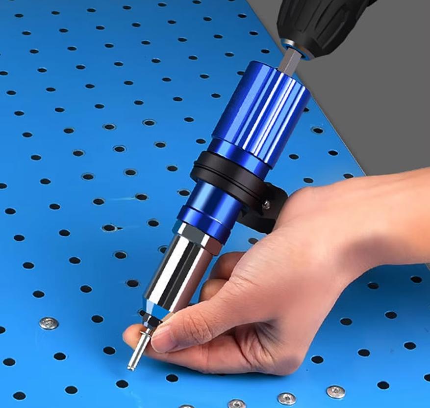 С помощью этого адаптера шуруповерт превращается в производительный заклепочный пистолет, позволяющий скреплять листовой металл и другие заготовки. Работает с вытяжными заклепками типа Ф2.4, Ф3.2, Ф4.0, а также Ф4.8.