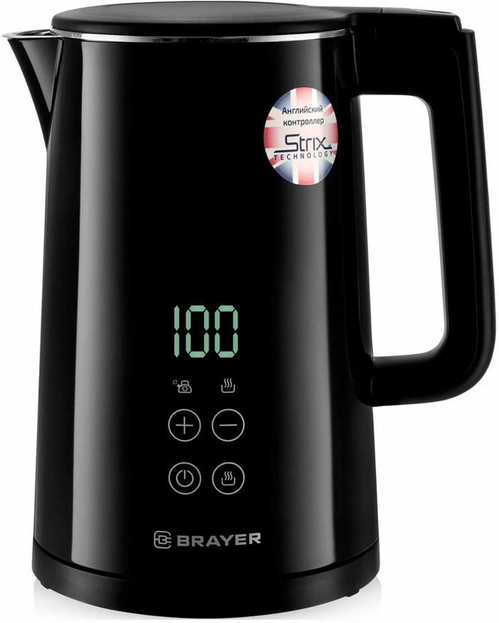 Интересен тем что имеет металлический корпус, из нержавеющей стали. Этот инертный материал не будет никак влиять на вкус воды, и не имеет рисков быть разбитым при падении. А, для того чтобы контролировать уровень воды, имеется вставка с окошком. Также дополнительным плюсом у данной модели является возможность регулировки температуры нагрева. С помощью регулятор на подставке можно выставить любую температуру в диапазоне от 35 до 100 градусов или же выбрать одну из пяти предустановленных программ: 40, 60, 80, 90, 100 градусов. И всё это будет удобно делать видя информацию на дисплее. Также не будет лишней функция поддержания температуры, которая позволяет держать температуру воды в нужном диапазоне температур до 12 часов. А еще у этой модели полностью съёмная крышка. Что весьма упрощает процесс заливания воды. Ну и тут есть различные защиты, благодаря наличию контроллера Strix. Такие, как автовыключение, защита от перегрева. И отключение, если в чайнике нет воды.