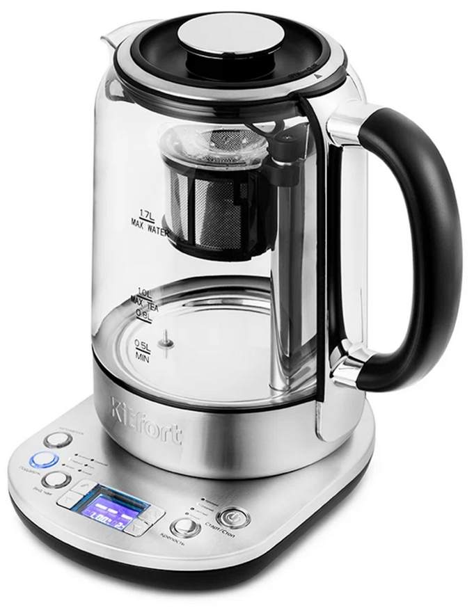 Ещё один чайник с корпусом из стекла. На подставке имеется сенсорная панель, которая позволяет настроить температуру нагрева воды. Диапазон температур у данной модели от 35 до 90 градусов цельсия (режим кипячения также имеется). Есть функция поддержания температуры, длительностью до двух часов. Имеются защиты от перегрева и включения без воды. Ёмкость чайника 1.7 литра, что является практически стандартом.