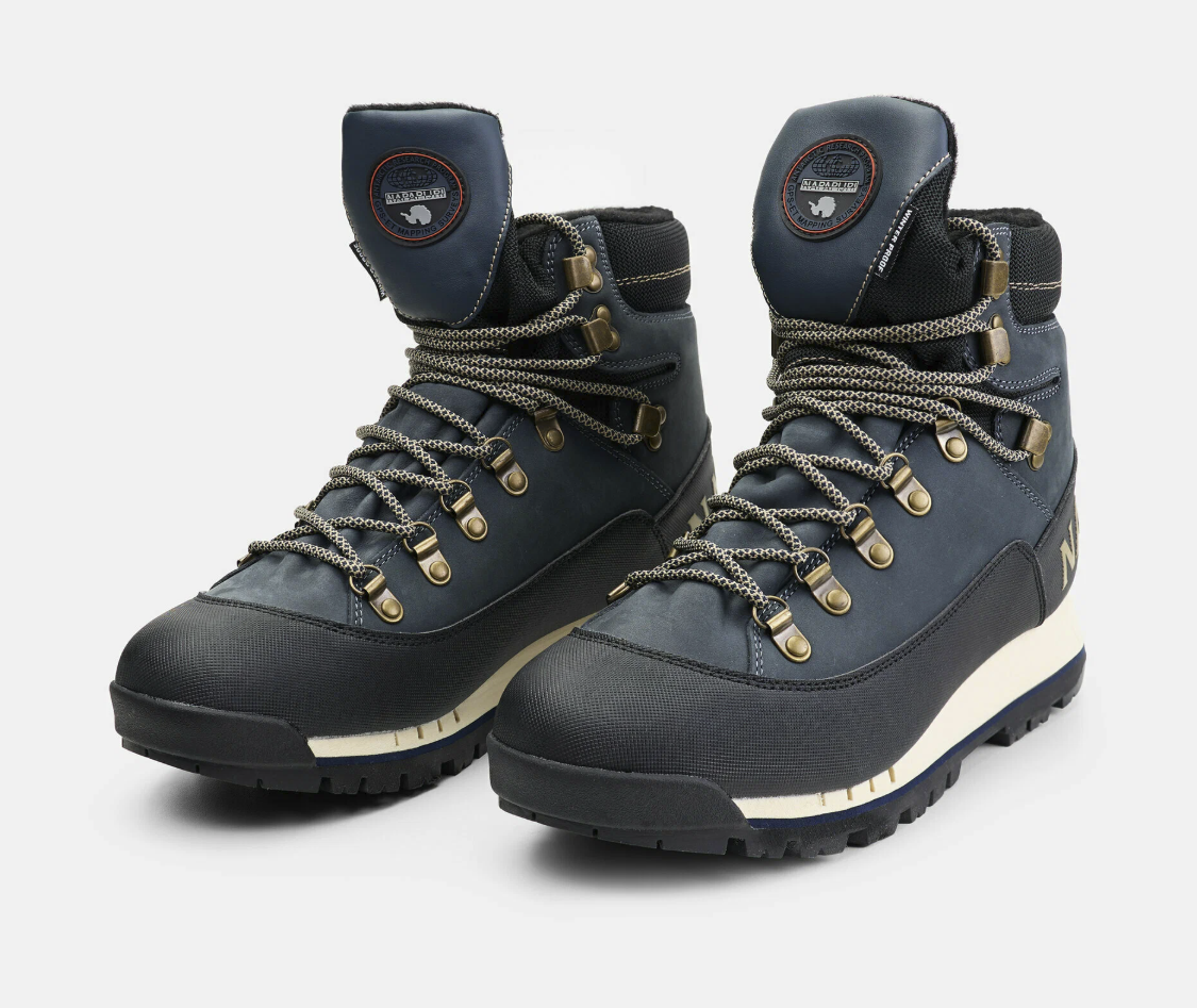 Это высокие городские хайкеры с мембраной DryVent(tm) и упором на влагозащиту и устойчивость. Верх выполнен из плотного холста из 100% переработанного ПЭТ, с кожаным воротником и усиленной пяткой из термопластичного полиуретана, сформованной под давлением для жёсткой фиксации задней части стопы.
