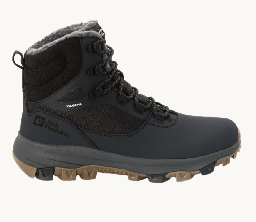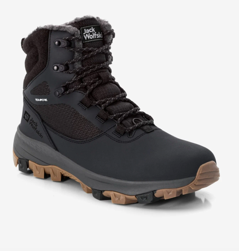 Это высокие хайкеры с мембраной TEXAPORE и утеплением, рассчитанным на работу до −30 °C. Верх выполнен из плотного полиэстера и полиуретана, без сетчатых вставок. Высокий голенищный профиль прикрывает щиколотку и снижает попадание снега при движении по сугробам.