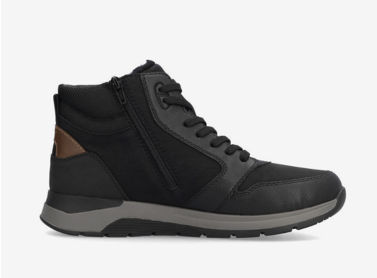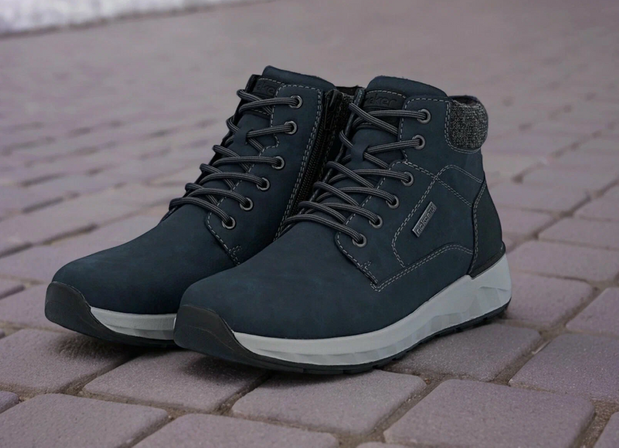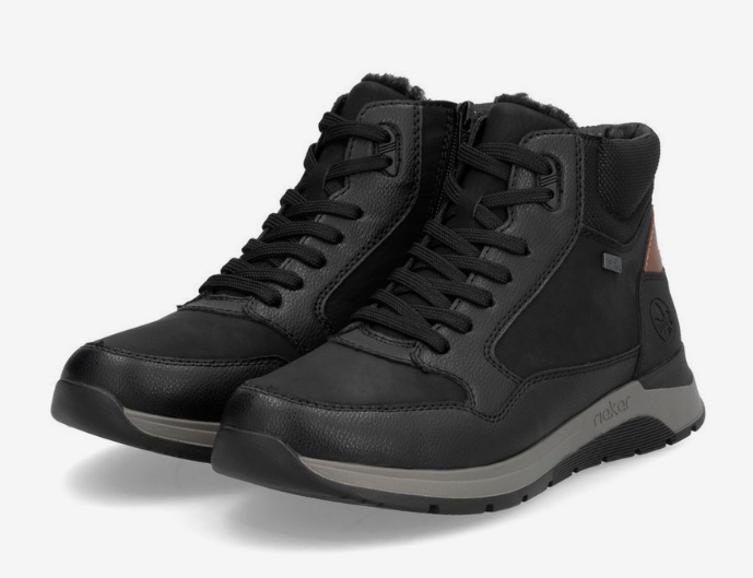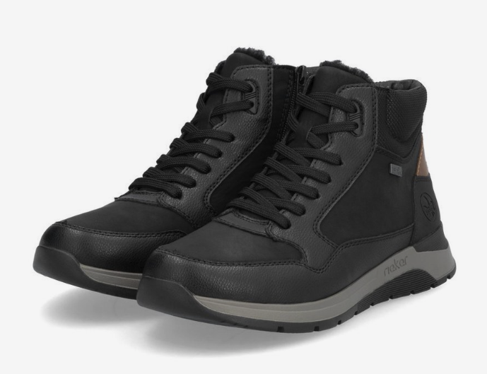 Верх из натуральной кожи с проклеенными швами и встроенной мембраной Rieker, рассчитанной на работу в холодной и влажной среде. Внутренняя подкладка выполнена из натуральной шерсти, которая формирует тёплый слой по всей площади стопы, включая носок и боковые зоны. Стелька также шерстяная, с амортизирующей основой.