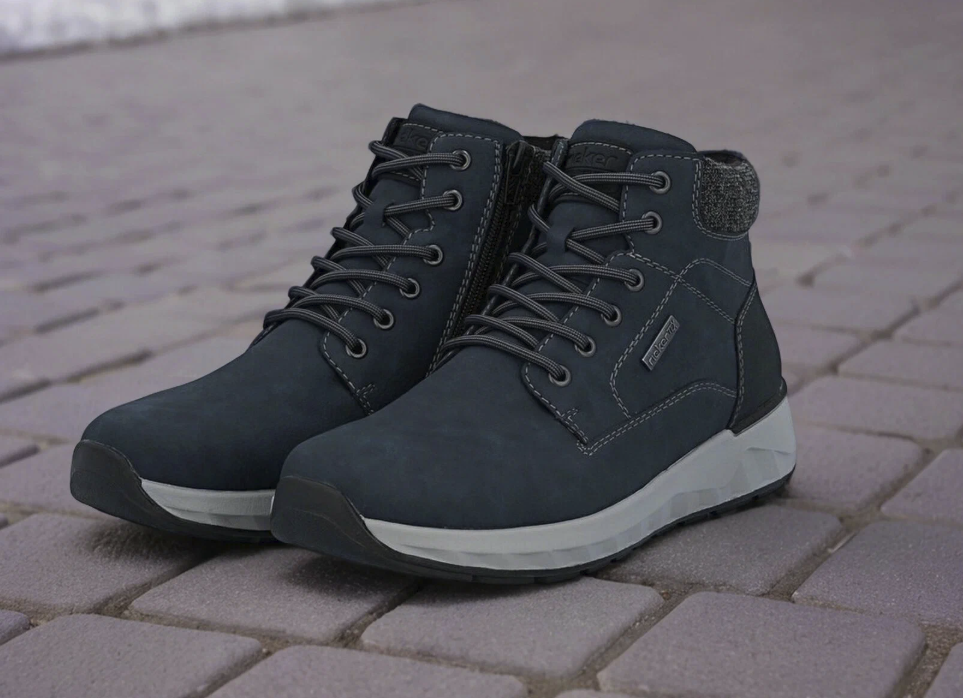 Внутри — слой искусственной шерсти и стелька из натуральной шерсти, формирующие тёплый объём по всей длине стопы. Мембрана RiekerTex встроена между верхом и подкладкой и работает как влагозащитный барьер для снега и слякоти.