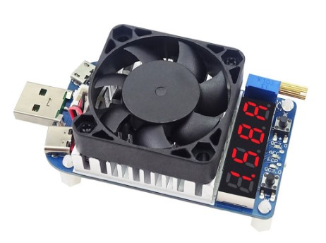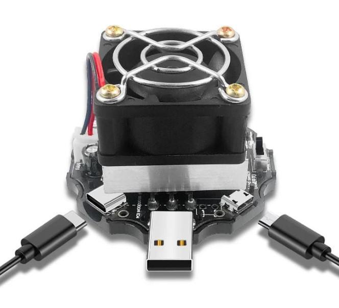 Мой фаворит, и мой основной электронный нагрузочный модуль, которым я тестирую зарядные устройства высокой мощности (мощностью от 35 ватт). Есть модификации как со встроенной системой охлаждения, так и сама плата. Рационально покупать версию без фирменной системы охлаждения, так как именно «родная» система охлаждения посредственно выполняет свою функцию отвода тепла (небольшой радиатор играет свою роль).
