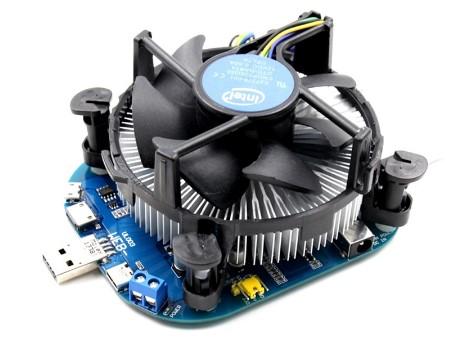Альтернатива Atorch DL24, для тех, кому не нужен дисплей. Кулер тут абсолютно идентичен боксовым решениям от Intel. Имеется джампер для настройки режимов работы вентилятора (3 режима: выключен, включается автоматически и всегда включен). В качестве регулировки потребляемой мощности, присутствует 2 переменных резистора, один который отвечает за «точную» регулировку, второй отвечает за «грубую» регулировку.
