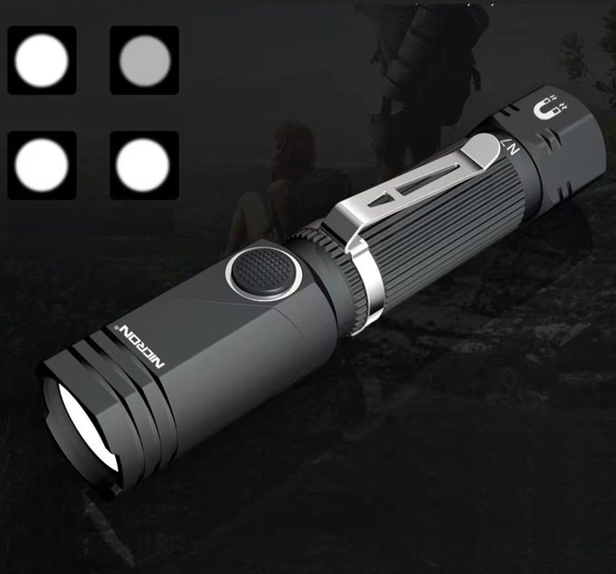 NICRON выпустила классный фонарик-трансформер, который оснащен поворотным модулем (может менять угол до 90 градусов, преобразуясь в Г-образную форму), что позволяет его использовать не только в качестве обычного, но и как налобный фонарь для работы и походов. Для второго варианта использования в комплекте даже идет мягкое оголовье. На торце отсека с батареей установлен мощный магнит для фиксации фонарика на металле, кроме этого на металлическом корпусе присутствует клипса. Работать устройство может в четырех режимах с возможностью изменения яркости свечения (также есть режим SOS и стробоскоп). Сила светового потока равна 600lm. В качестве источника питания применена сменная батарея типа 14500 (можно взять в комплекте), также фонарик может работать и от батареек типа АА. Степень защиты от воды IP65.