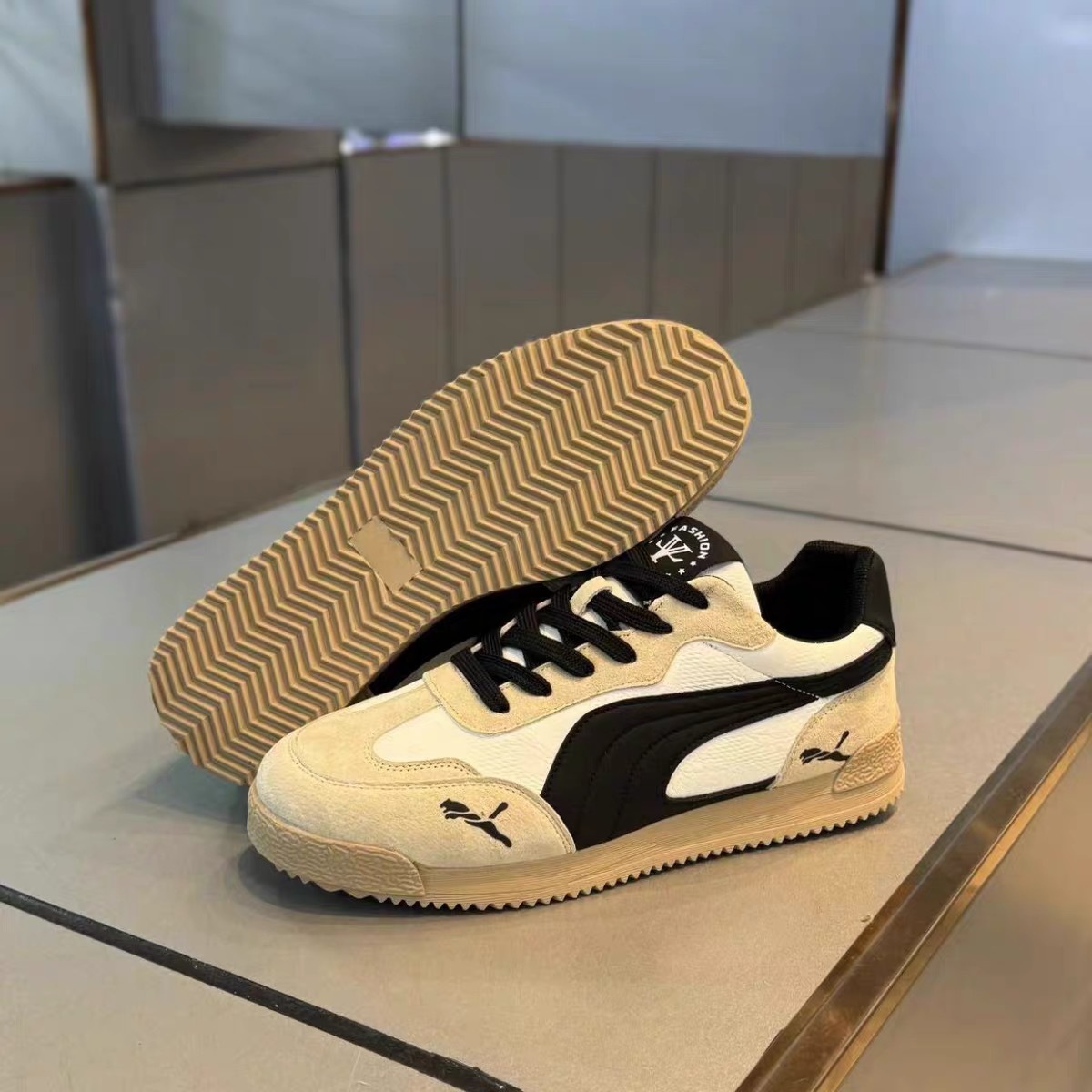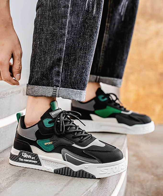 Верх кроссовок из искусственного PU, подкладка хлопчатобумажная, стелька мягкая. Подошва резиновая, прошитая, шнуровка регулирует плотность посадки. Высота щиколотки низкая, металлических элементов нет. Доступны размеры 39-46, цветовые варианты: хаки, бело-зелёный, чёрный. Модель предназначена для повседневного ношения.