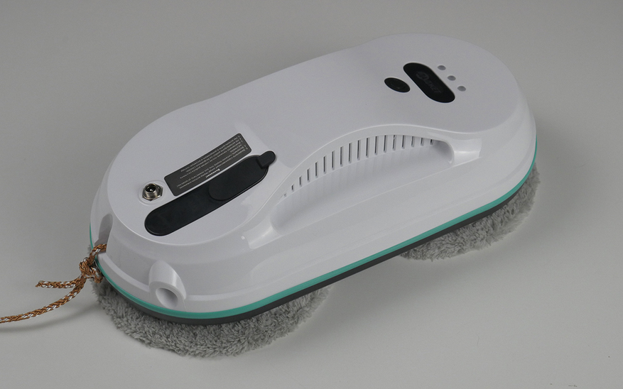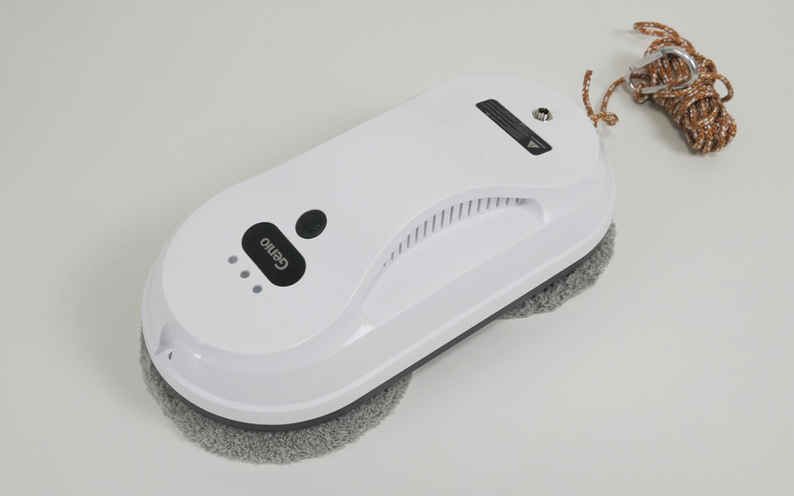 Даджет W200 — обтекаемый стекломой с простой, но функциональной конструкцией. Обычный белый пластик, без изысков. Вместо страховочного троса, по сути, тонкая веревка. Специальных креплений нет — пропускаем в проушину и на узел. Управление только через пульт — ничего лишнего. Зато Даджет W200 оборудован бачком с распылителем. Первый цикл желательно отработать сухими мопами, чтобы счистить со стекла пыль, затем заменить их и запустить влажную уборку. Мойщик размачивает присохшие пятна и тут же вытирает мопами, поэтому по результату уборки мало чем уступает премиальным роботам. В комплекте всего 5 пар салфеток, но и стоит Даджет W200 всего 11 тысяч — отличный ценник для мойщика с такими возможностями!