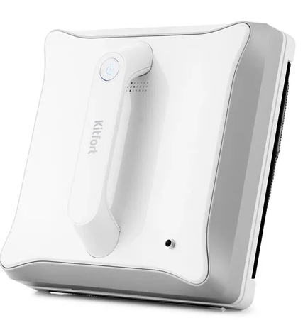 Kitfort KT-564 — мойщик традиционной конструкции. Над корпусом возвышается рукоять-скоба и единственной кнопкой. Снизу — рабочие инструменты: гусеницы помогают двигаться по влажному стеклу; под решеткой создаётся вакуум, удерживающий робота на окне; салфетка с большим вырезом статичная, она отмывает грязь за счет давления на поверхность. Алгоритм запуска предельно прост: переключаем тумблер, прижимаем Kitfort KT-564 к стеклу, нажимаем на кнопку и ждём, когда присосётся. Можно установить приложение, но проще управлять с пульта — выбрать оптимальную траекторию, всё остальное робот сделает сам. Доехав до края зеркала, не упадёт, т.к. сработают угловые датчики. Если вдруг отключится электричество, будет ещё 1/4 часа работать от ИБП. Kitfort KT-564 подходит для устранения не сложных загрязнений на стеклах любого размера.