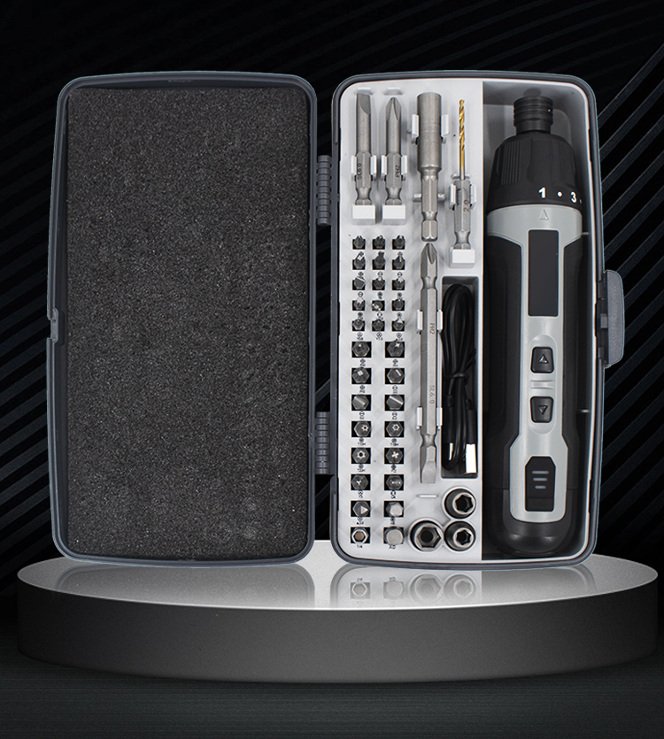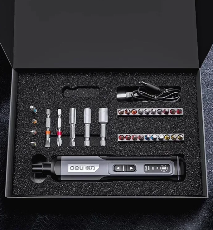 Модель работает от батареи 1500 мА·ч, поддерживает несколько уровней крутящего момента и режим полного отключения. В набор входят 12 бит длиной 50 мм из стали S2. Отвёртка оснащена магнитным мотором, металлическим редуктором и круглой LED-подсветкой, корпус с двухслойной нескользящей ручкой, вес — 250 г. Зарядка через USB Type-C, хранение — в алюминиевом кейсе с ложементом.
