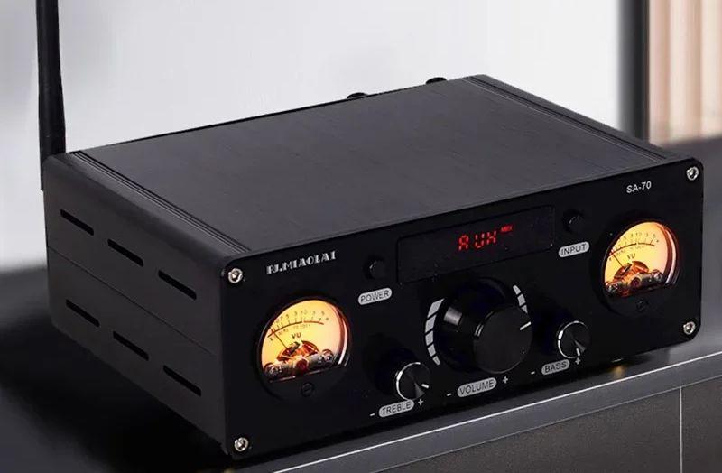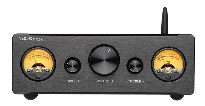 Еще одна модель на эффективном чипе усилителя TPA3255, но с аналоговыми стрелочными индикаторами для каждого канала (с желтой подсветкой). Заявленная мощность до 250 Вт, имеется балансный вход XLR, Bluetooth для приема треков со смартфона. Не забыли выход для сабвуфера и цифровые входы оптика/коаксиал (ЦАП ES9023). Треки с «флешки» USB-A можно послушать напрямую.