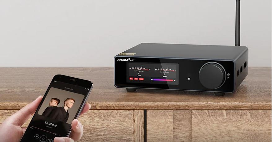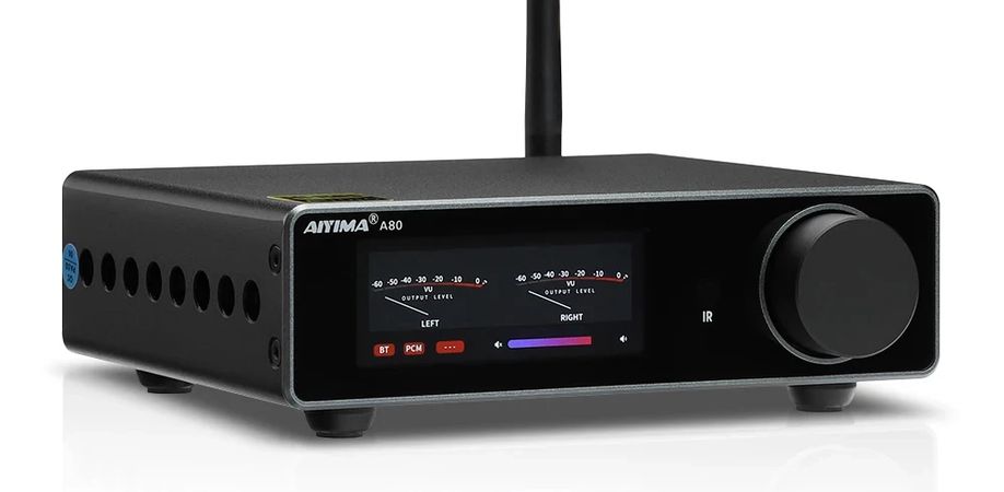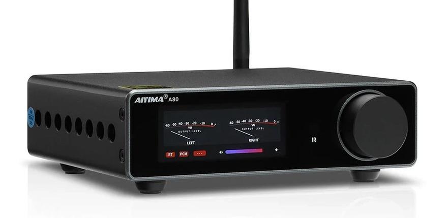 Открывает список настольный стерео усилитель с цифровым дисплеем от AIYIMA. Цветной экран показывает при работе три вида индикаторов уровня или спектроанализаатор. Тут не просто усилитель, причем довольно мощный на TPA3255 PFFB (до 300 Вт) с цифровой громкостью NJW1194, но и встроенный ЦАП (ESS9038Q2M) с цифровыми входами (USB, OPT, COA) и Bluetooth-модуль с кодеком aptX HD. Активный сабвуфер легко подключается.