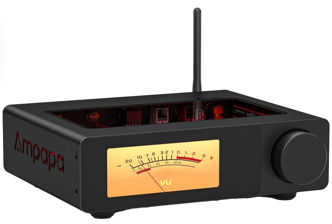В этом усилителе необычное сочитание предварительно буфера на лампах (GE5654) и высоко эффективного усилителя мощности класса D (MA12070 от Infineon Technologies). Выходная мощность 80 Вт на канал на нагрузку 4 Ом, есть ЦАП (оптика/коаксиал/USB-плеер) и Bluetooth с внешней антенной (SoC BP1048).