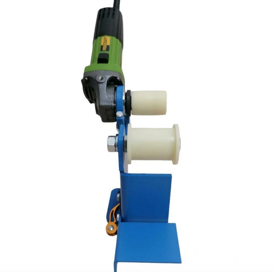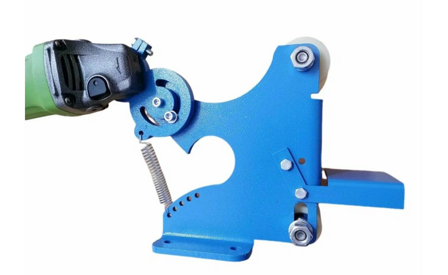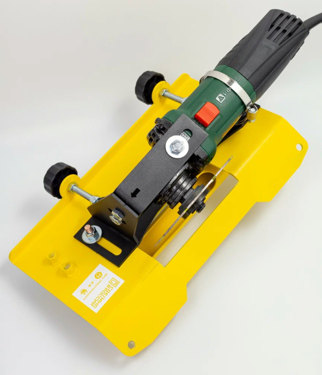 Насадка совместима с большинством УШМ 115-125 мм, крепится быстро: болгарка фиксируется в П-образной струбцине и дополнительно притягивается червячным хомутом, исключающим смещение. Угол наклона регулируется точно, можно выставить как классические 45°, так и чуть больше — до 48°, если нужно подогнать край под конкретный клей или плитку.