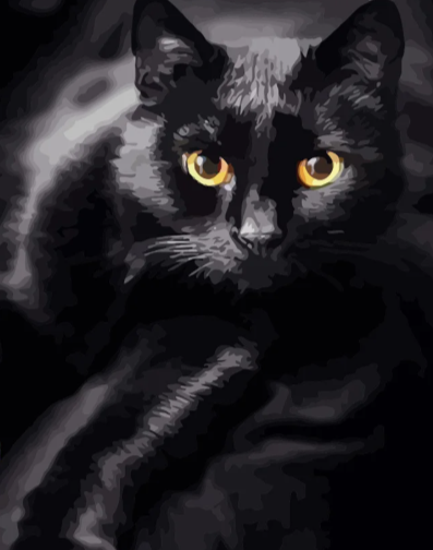 Картина по номерам выполнена на льняном холсте. Сюжет — черный кот. Рисунок пронумерован, а рядом с ним указаны названия цветов, что облегчает выбор нужного оттенка и позволяет аккуратно раскрашивать каждый участок.