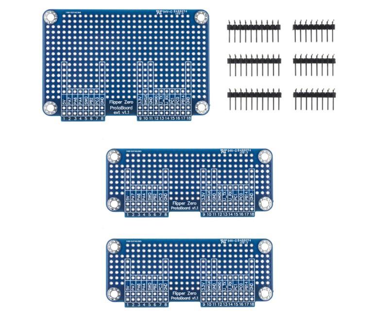 Различных совместимых модулей множество, но самое главное, что есть возможность для создания и установки своих собственных шелков и плат расширений. Для этого потребуется начальное знание электроники небольшие макетные платы, подходящие для GPIO разъемов мультитула Flipper Zero. Это открывает перед пользователями новые возможности в управлении различными устройствами и создает дополнительные сферы применения гаджета. В комплект оригинального набора входит сразу три макетные платы — две среднего размера и одна большая. Дополнительно в наборе присутствуют штыревые соединители для пайки (шаг 2.54 мм).