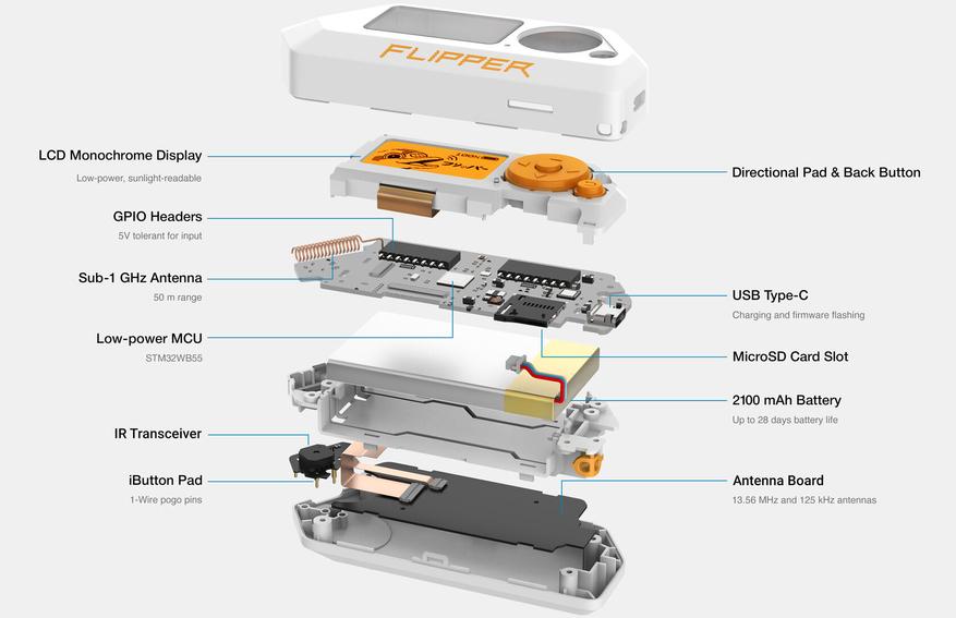 Давно хотел купить себе оригинальное устройство Flipper Zero для копирования различных ключей и брелоков, но цена, мягко говоря, кусается. Нашел недорогие варианты — делюсь с вами ссылкой, а также ссылками на полезные дополнительные модули для Flipper Zero. Этот гаджет представляет собой оригинальное устройство с открытым исходным кодом. Обладая широким спектром функций и возможностей, Flipper Zero становится полезным инструментом для исследования радиопротоколов, систем контроля доступа, аппаратного обеспечения и многих других областей. Кроме того, Flipper Zero может использоваться для проверки автомобильных брелоков и пультов от шлагбаумов, что делает его незаменимым помощником при исследовании и тестировании различных устройств и систем. Устройство также обладает возможностью управления устройствами с инфракрасным интерфейсом, что расширяет его функциональность и делает его универсальным инструментом для различных задач. Одним из интересных применений Flipper Zero является возможность использования устройства в качестве инфракрасного пульта дистанционного управления. Для того чтобы было понятно, какими возможностями и интерфейсами обладает устройство, прикрепляю ниже «взрыв-схему» с официального сайта.