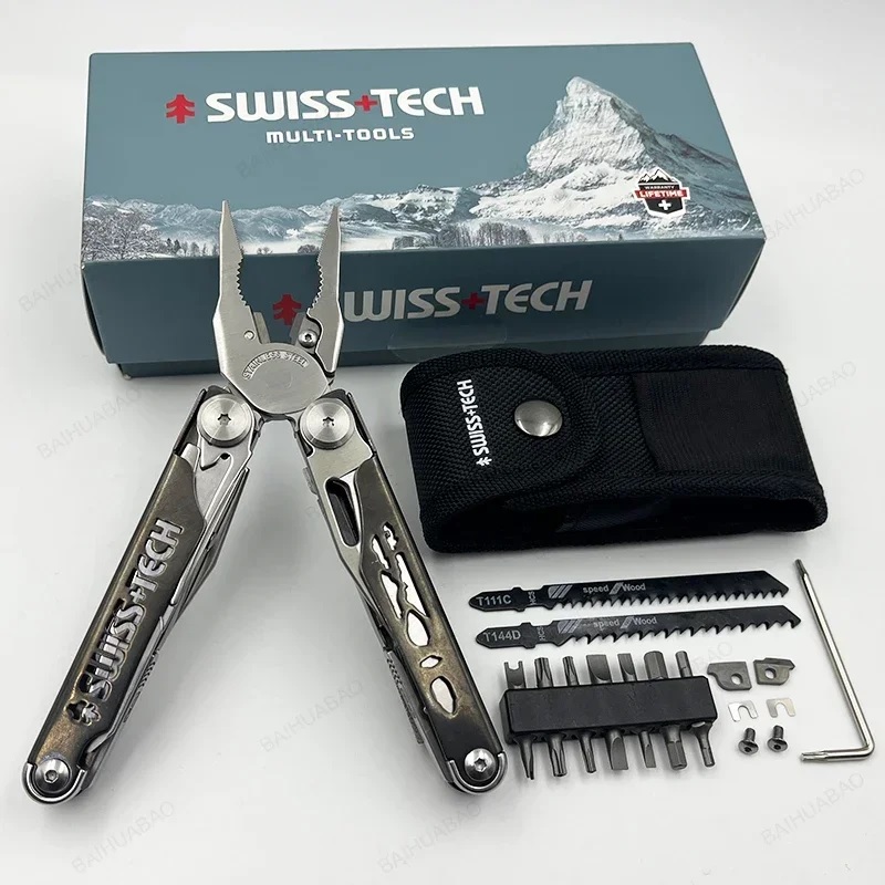 Многофункциональный инструмент «37 в 1» объединяет широкий набор функций в одном корпусе, включая плоскогубцы, ножницы, кусачки, пилу и другие элементы, что делает его универсальным решением для различных задач. Корпус выполнен из прочной нержавеющей стали с матовым покрытием, устойчивым к коррозии и износу. Особенностью модели является сменное пильное полотно, которое обеспечивает стабильное качество реза при работе с древесиной и другими материалами.