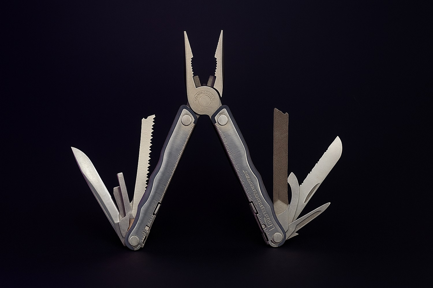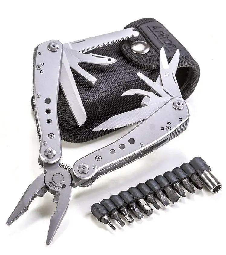 В его арсенале широкий набор инструментов, включая два лезвия (с прямой и серрейторной заточкой), пилу по дереву, напильник, шило, долото, открывалки для бутылок и консервов, крестовые и плоские отвёртки разных размеров, кусачки для перекусывания проводов, а также транспортир и линейку. Также предусмотрен держатель для бит 1/4 и комплект сменных насадок (Phillips, плоские, торкс и шестигранники).