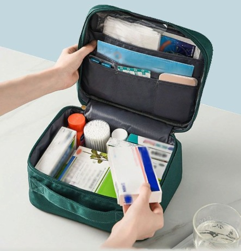 Аптечка выполнена из непромокаемого материала, поэтому её можно брать с собой в путешествие и даже в поход. Снаружи имеется ручка для переноски.