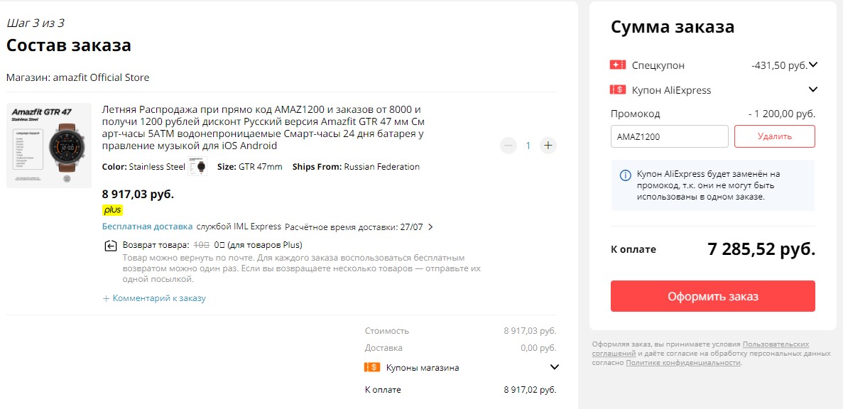 Купоны от официального магазина Amazfit Official Store для покупателей из РФ — AMAZ1200 — дает скидку в 1200 рублей на смарт часы Amazfit GTR 42, Amazfit GTR 47 и Amazfit GTS, а купон AMAZ750 — дает скидку в 750 рублей на смарт часы Amazfit GTR Lite. Умные часы Amazfit в наличии в российских магазинах, доступны к заказу и имеют привлекательную стоимость.