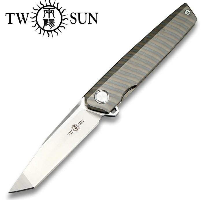 Интересный вариант от TWOSUN — флиппер с 3Д обработкой накладок. Клинок из стали D2 (твердость 58-59 единиц). Используется износостойкий подшипник.