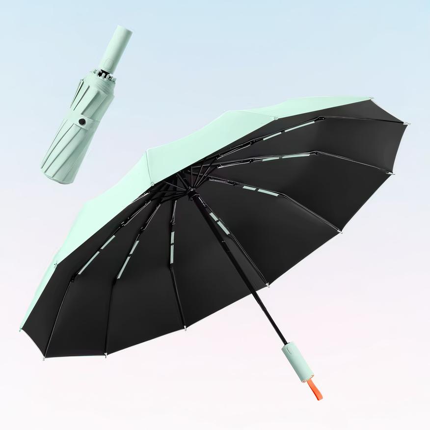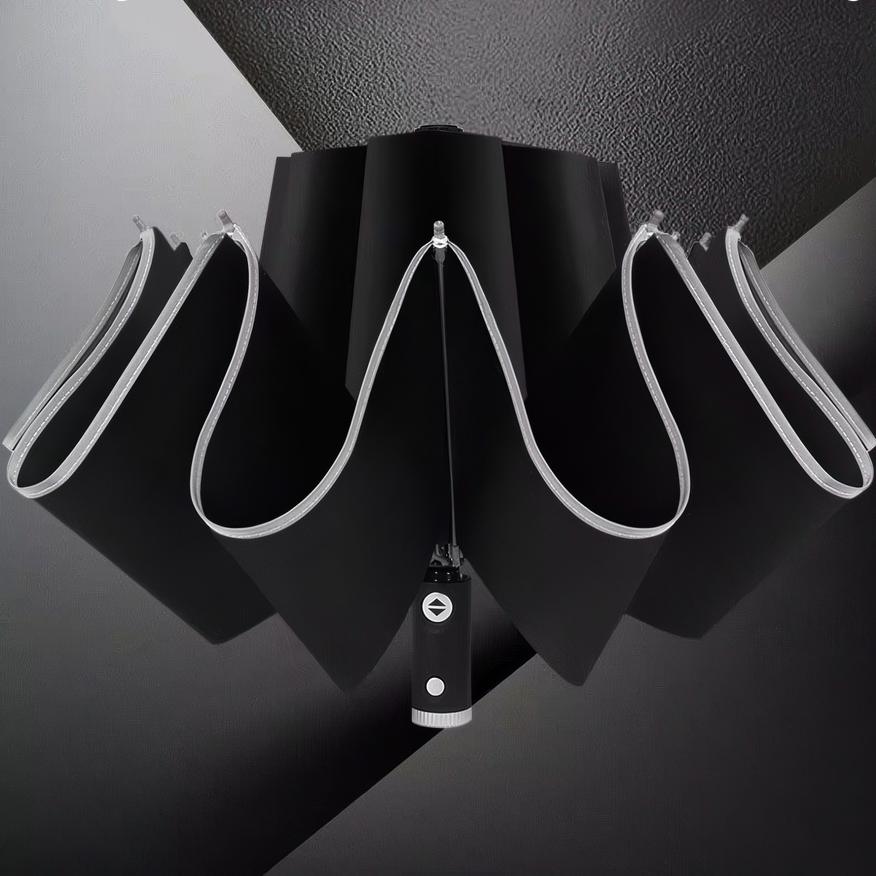 Помимо инновационного механизма складывания, зонт оснащён автоматической системой раскрытия-закрытия, управляемой одной кнопкой. Безопасность владельца обеспечивает светоотражающая полоса по краю купола — незаменимая деталь, чтобы в условиях дождя со снегом и околонулевой видимости в вас не впечатался очередной любитель гонок на электросамокатах или доставщик на берущем звуковой баръер велосипеде.
