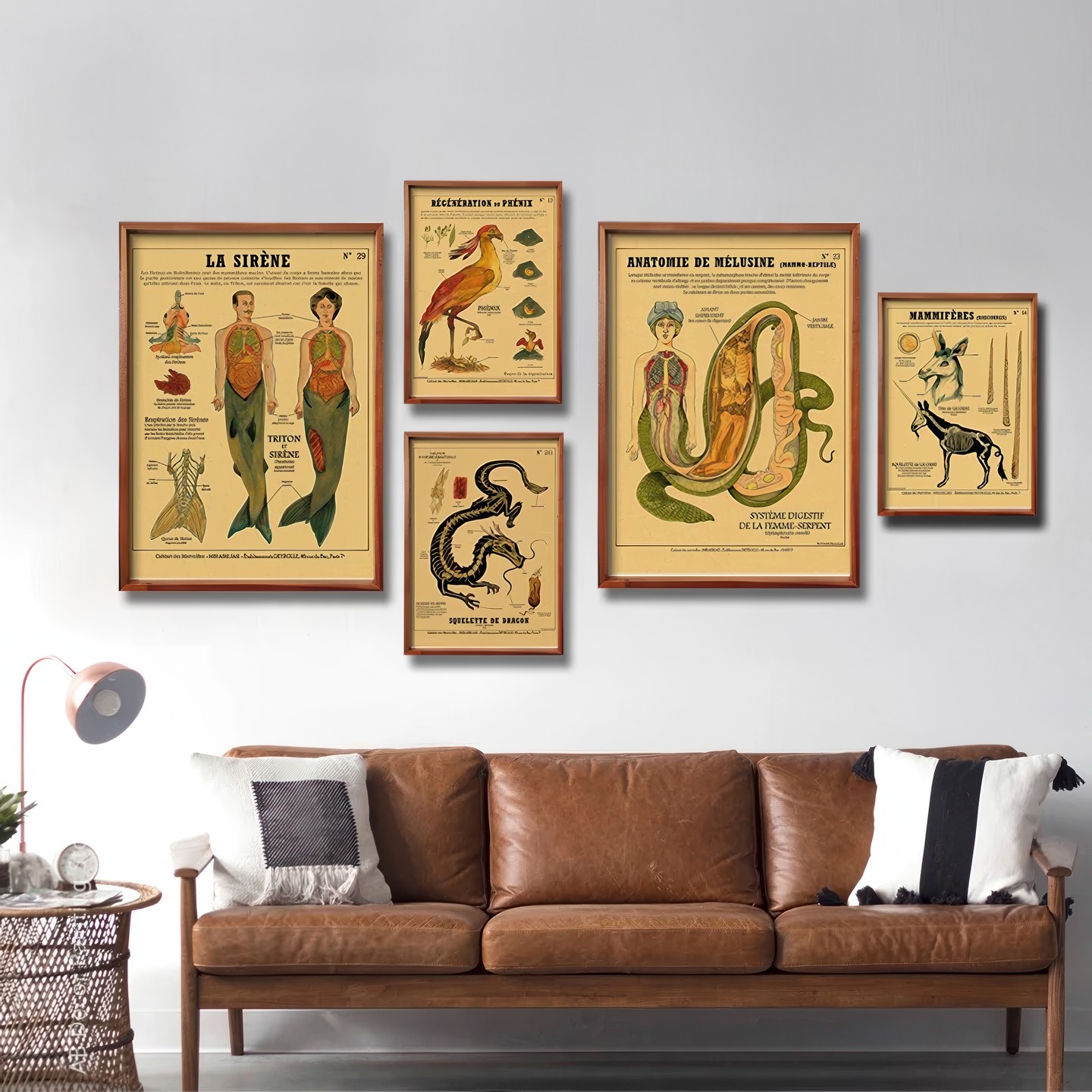 Особый шарм этим плакатам придают французские подписи — хотя, признаюсь, латынь смотрелась бы ещё атмосфернее. Каждая иллюстрация выполнена в винтажном стиле, напоминающем иллюстрированные атласы XIX века, что добавляет им загадочности и научной достоверности.