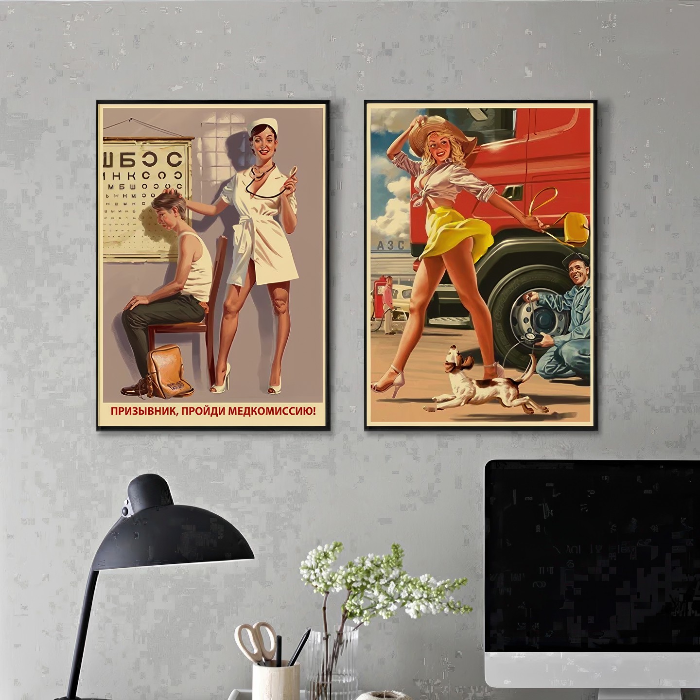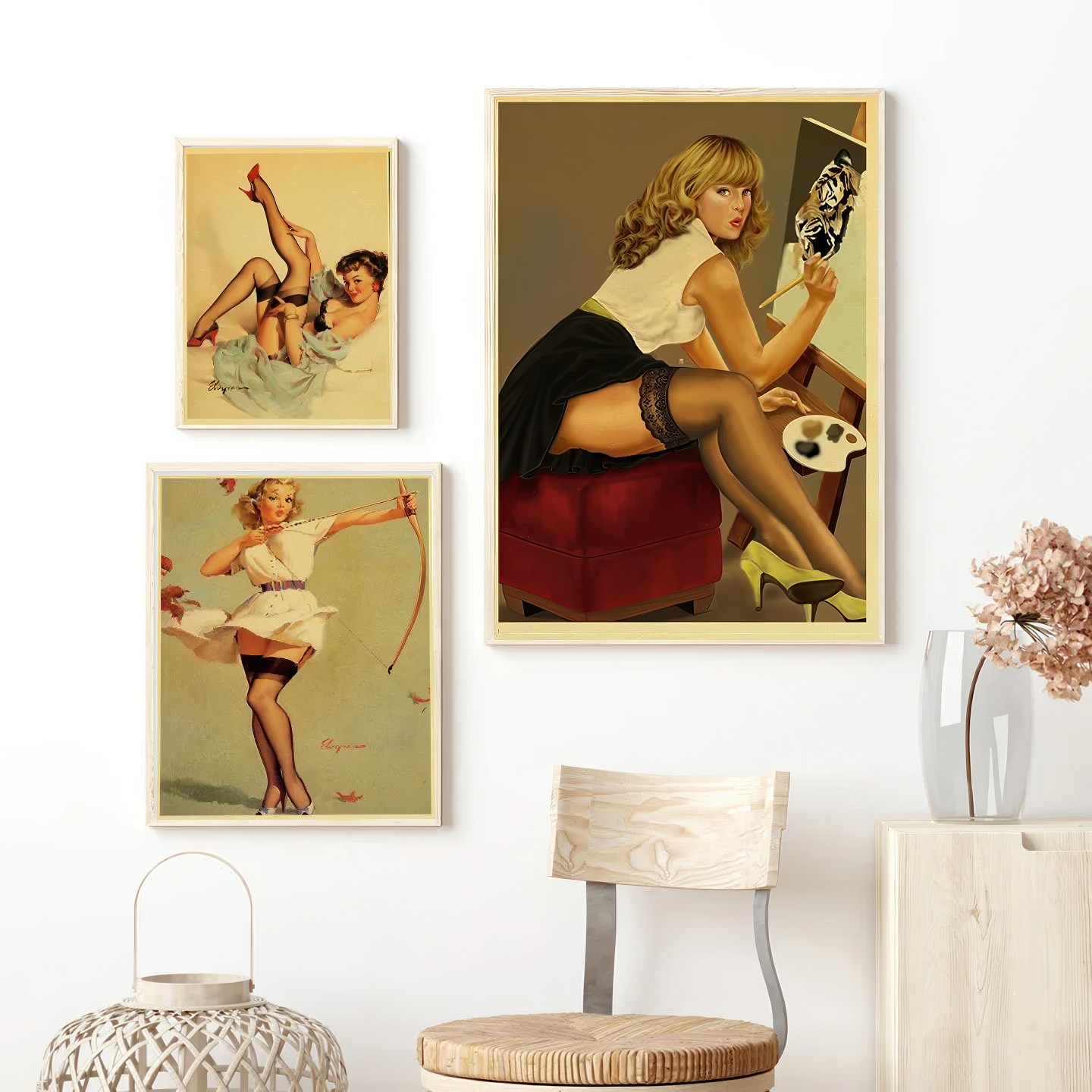 Примечательно, что все плакаты представлены без текстовых подписей — только чистое визуальное искусство. Игривые позы, яркие краски и характерный стиль создают неповторимую атмосферу той эпохи, когда женственность воспевалась через призму лёгкой провокации и изящного юмора.