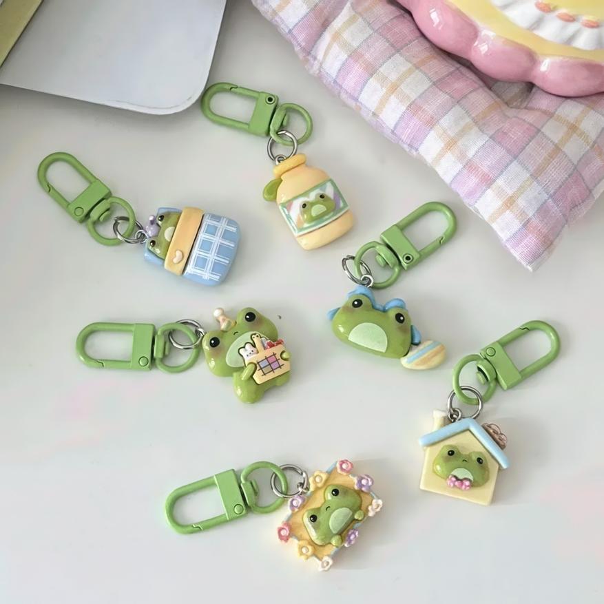 Поклонникам мультяшного стиля наверняка придётся по душе набор из шести вариантов брелков с весёлыми лягушками. Коллекция включает как классического лягушонка, так и целые мини-сценки из жизни: особенно забавно смотрятся лягушка, с любопытством выглядывающая из стеклянной банки, и деловитый вариант с корзинкой покупок. Каждый персонаж словно застигнут в разгар какой-то увлекательной истории.