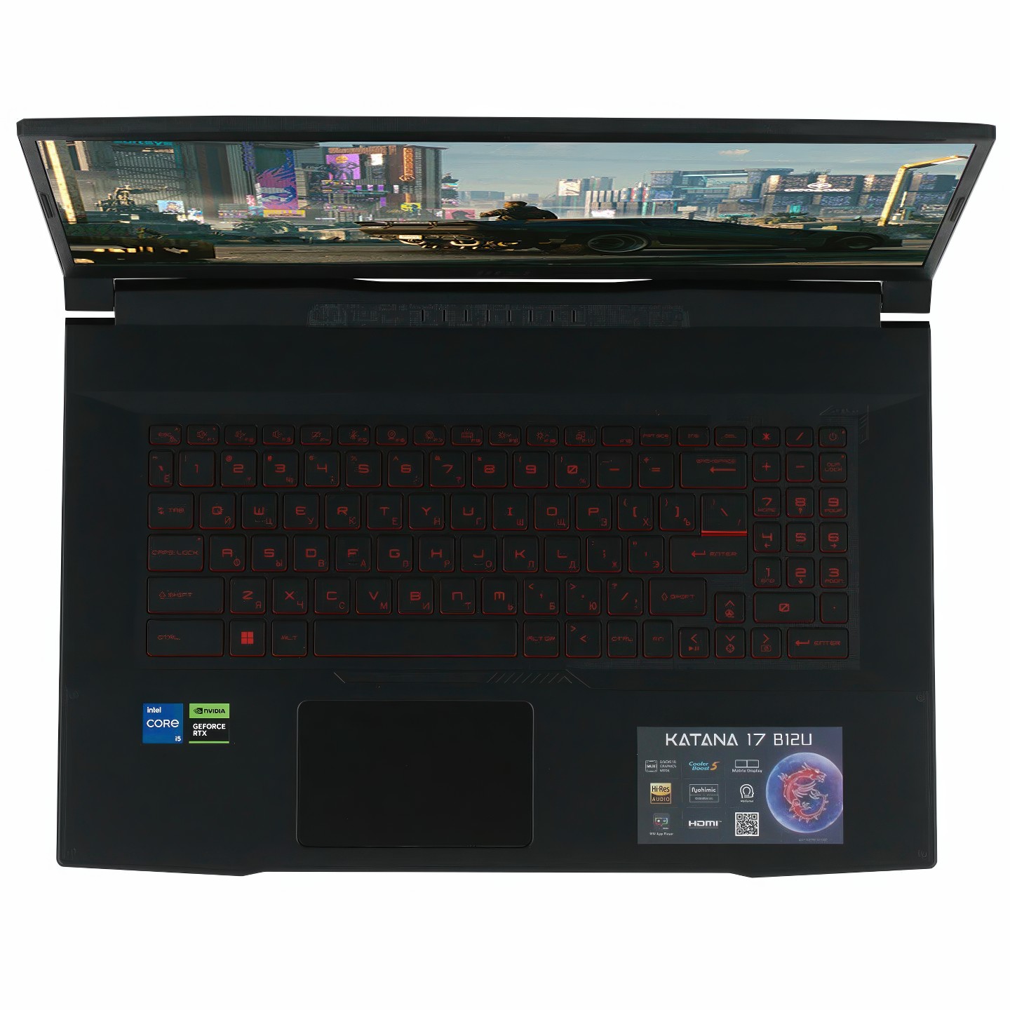 На верхней границе бюджета в 79 999 рублей расположился самый крупный участник обзора — MSI Katana 17 с впечатляющим 17,3-дюймовым экраном Full HD и частотой 144 Гц. Полноразмерная клавиатура с русской раскладкой и цифровым блоком дополняет картину, однако остальные характеристики довольно скромные — уже прекрасно нам знакомый процессор i5-12450H и всего 8 гигабайт оперативной памяти.