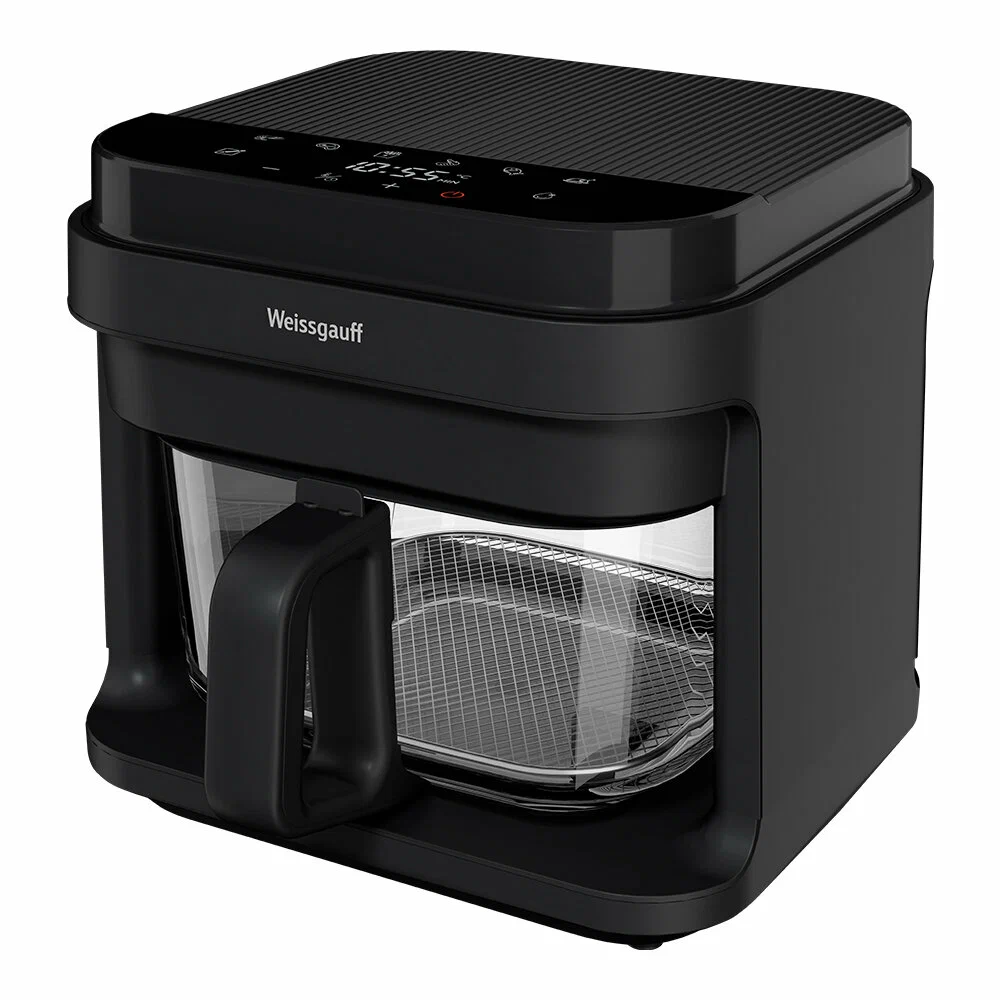 Эксклюзивный участник рейтинга, оборудованный прозрачной чашей из стекла. Это позволяет визуально контролировать степень запекания, не прерывая процесс. Вместо классического ТЭНа здесь задействован карбоновый излучатель — он разогревается в разы быстрее и распределяет жар максимально равномерно.