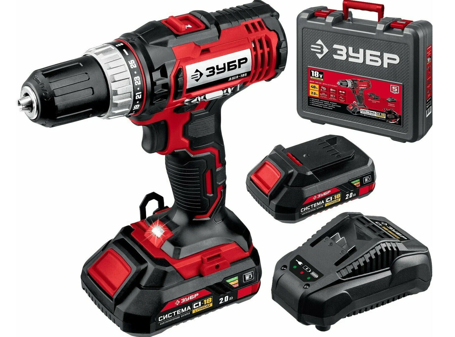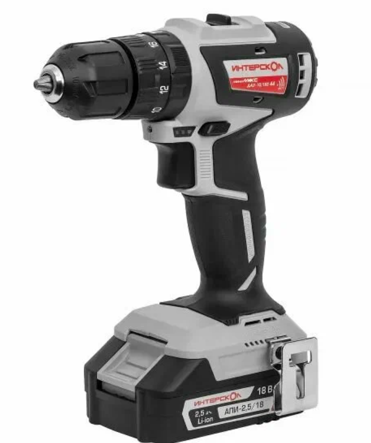 Не сдает позиций и компания Интерскол. Они представили шуруповерт со схожими функциями, но с уникальной элементной базой в аккумуляторах. Тут заявлена емкость на 2.5Ач и напряжение 18В. Крутящий момент до 44Нм достигается при помощи бесщёточного двигателя, а в комплекте два аккумулятора и пластиковый кейс. Для зажима сверл и бит используется укороченный одномуфтовый бесключевой патрон, как проверенная база среди таких инструментов. Есть подсветка зоны сверления, двухскоростной выбор режима работы и ударный способ.