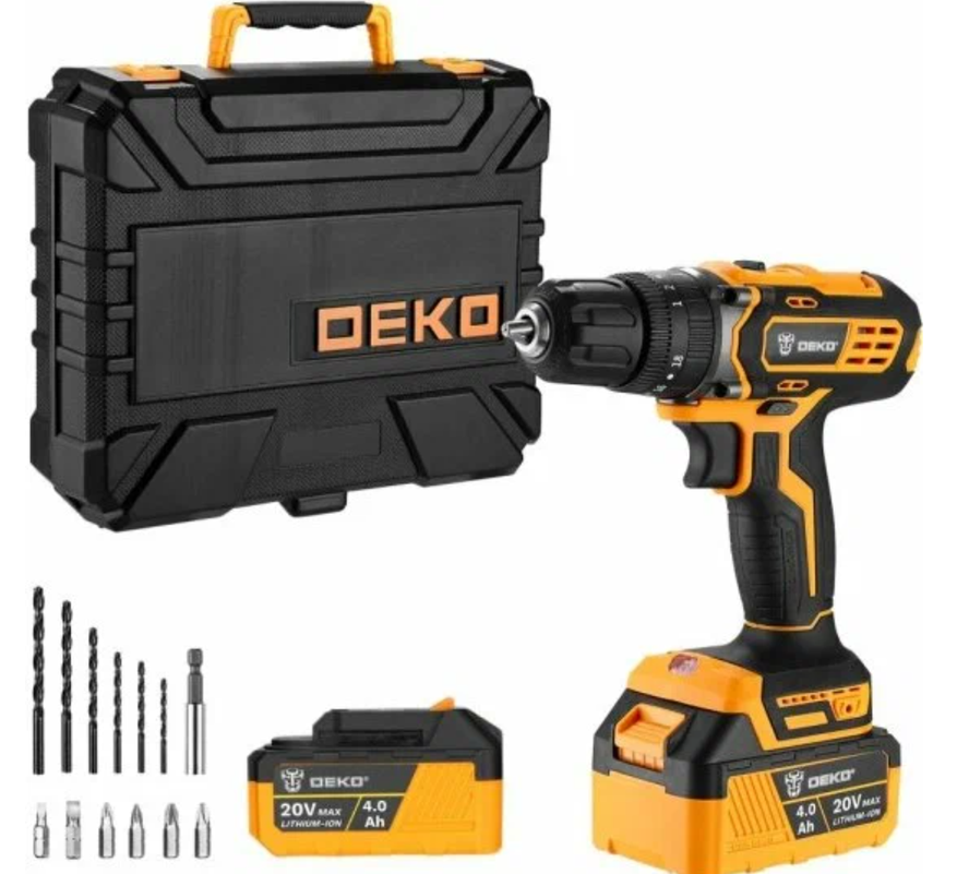 Этот шуруповерт от китайского производителя инструментов DEKO. Его выделяют два массивных аккумулятора на 20В 4Ач. Они конечно уже значительно более крупные, но и дают большую автономность. Двигатель достигает крутящего момента 45Нм, что уже хороший уровень для сверления и закручивания саморезов. По отзывам вся оснастка в комплекте одноразовая, хоть там и немало всего, так что её сразу под замену, но пластиковый кейс удачный. Аккумуляторы совместимы с «макитовскими», есть ударный режим.