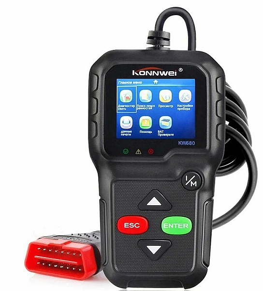 Еще один прибор с вынесенным на кабеле подключением к диагностическому порту от Konnwei. Работает с бензиновыми и дизельными легковыми авто с 1996 года выпуска (по протоколам OBD II и CAN), упрощает диагностику встроенная обширная библиотека описаний кодов неисправностей, есть доступ к специфичным для производителей авто кодам. Но наши авто нормально читаются только с выпуском от 2012 года.