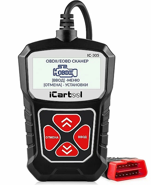 Недорогая модель с ч/б дисплеем и вынесенным на кабеле разъемом от iCartool. Работает с легковыми авто по протоколу OBD II, рассчитана на быстрое начало работы неподготовленными пользователями (есть база с расшифровкой кодов неисправностей). В оболочке есть русский язык. С отечественными машинами может быть ограниченная совместимость.