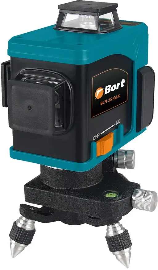 Инструмент с зеленым (505 нм) лазерным лучом от бренда Bort. Ротационные излучатели обеспечивают построение горизонтальной и вертикальной плоскости, видимой на 25 м (50 м с приемником). Всего 12 линий с точностью 0,2 мм н 1 метр. Угол самовыравнивания прибора в пределах 3°.