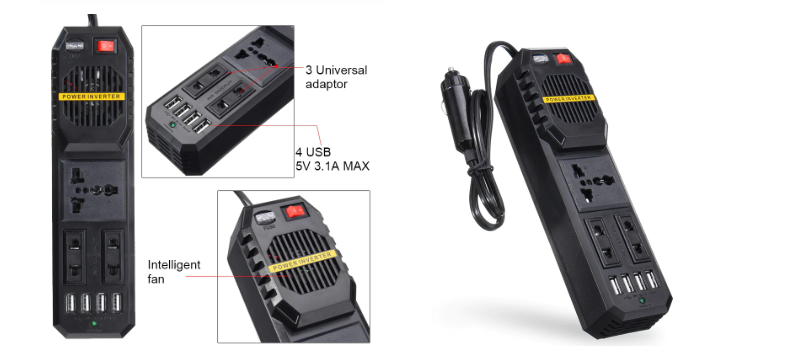 Компактный инвертор для питания устройств, зарядников, блока питания ноутбука в машине. По размерам чуть больше привычного «пилота». Есть 1 силовая розетка, две для зарядных устройств, 4 USB порта.