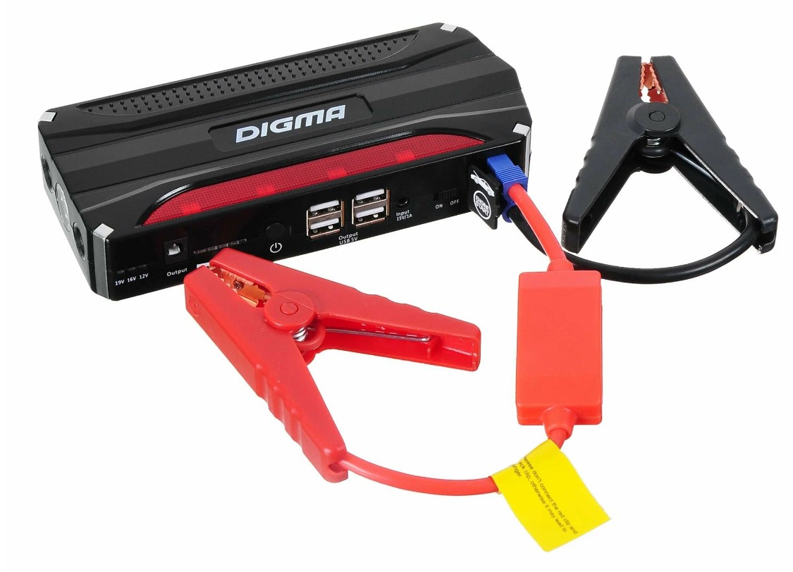 DIGMA DCB-160 — пуско-зарядное устройство для зарядки автомобильных аккумуляторов с функцией пауэрбанка. Устройство поставляется в фирменной коробке и комплектуется клеммами для автомобильных аккумуляторов, а также двумя блоками питания для подзарядки от обычной розетки и прикуривателя.