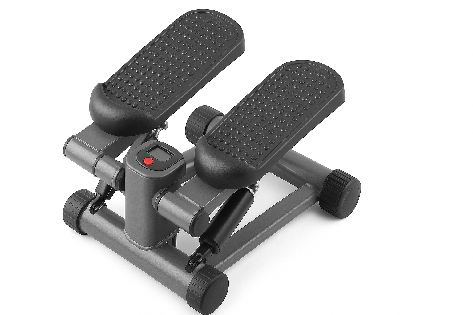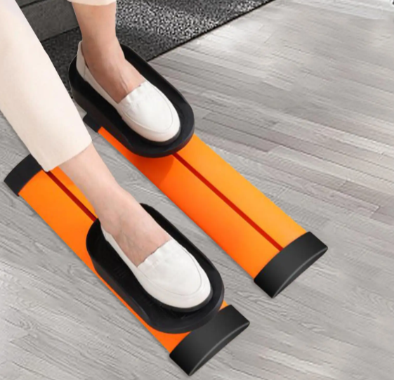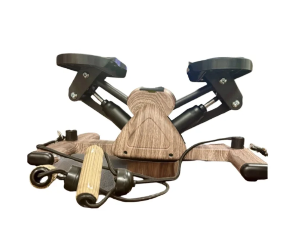 Устройство включает два выдвижных мини-степпера с ножными педалями для движения вперед и назад. Возможность регулировки угла наклона педалей позволяет настроить оптимальный уровень нагрузки и интенсивности тренировки. Эти платформы имеют противоскользящие накладки, которые обеспечивают надежное сцепление с полом. Конструкция изготовлена из прочного пластика, рассчитанного на регулярное использование, что увеличивает срок службы тренажера.