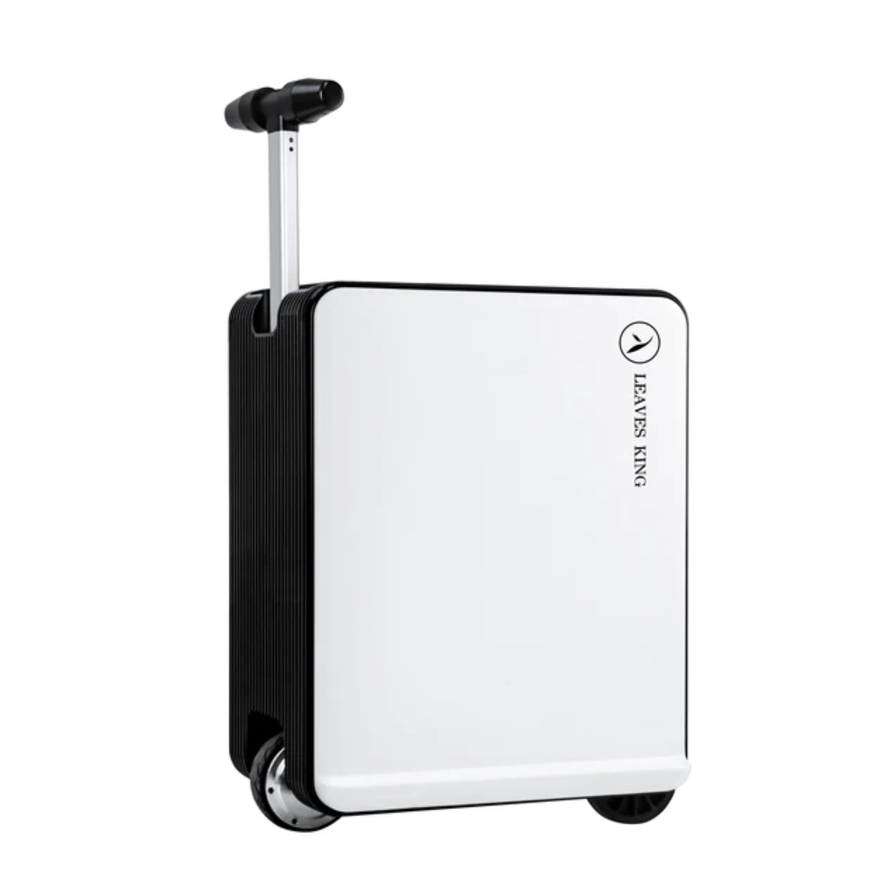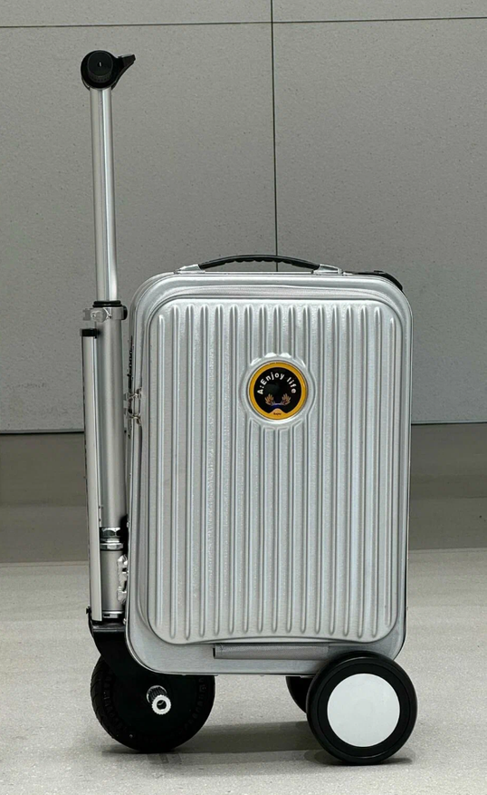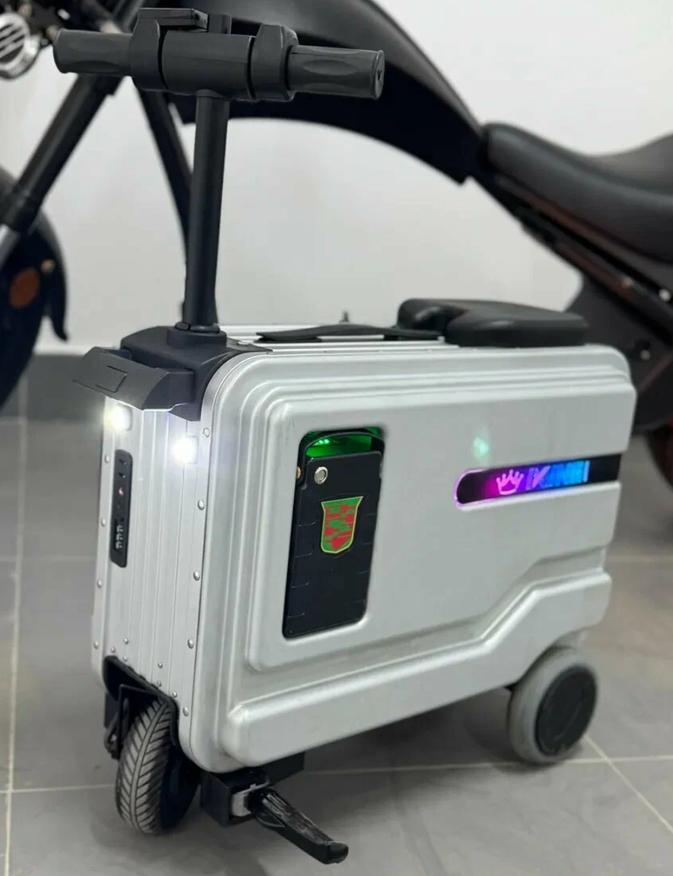 Этот чемодан представлен только в серебряном цвете. Он способен разогнаться с грузом до 16 км/ч и несет вес до 120 кг. Сам при этом имеет объем 30 литров и весит 7.5 кг. Руль самоката выглядит совершенно по-взрослому, есть гашетка скорости и цифровой дисплей. Он утапливается в корпус чемодана, а для комфорта перемещения сидя есть даже накладное седло. Более того, есть фары для освещения пути. Если использовать как чемодан, то можно отметить надежные колеса, телескопическую ручку и кодовый замок. Логотип на боку чемодана также имеет подсветку.