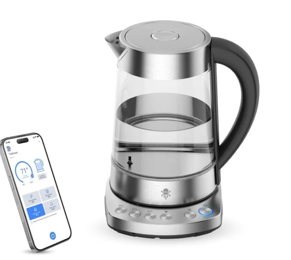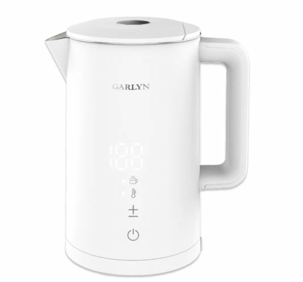 Удобная модель электрочайника от бренда GARLYN. Это смарт-чайник для умного дома GARLYN K-250S с возможностью удаленного управления с помощью планшета или смартфона, а также с возможностью управления голосом через умные колонки. На корпуса чайника предусмотрен небольшой дисплей и пара сенсорных кнопок, позволяющих отрегулировать температуру. В самом чайнике предусматривается терморегулятор и есть возможность установить подогрев в широком диапазоне: от 40 градусов до 100 градусов с шагом 10 градусов, в том числе и включить поддержание заданного значения. Внутри размещена сплошная колба из нержавеющей стали — посмотреть уровень воды, не открывая крышку, не получится.