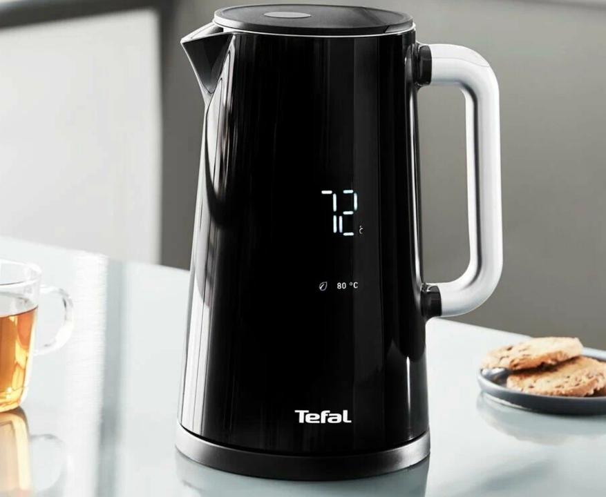 Электрочайник Tefal приглянулся скромным дизайном — это черный глянцевый термостойкий пластик с колбой из нержавеющей стали внутри. На корпусе самого чайника разместили дисплей-терморегулятор и есть возможность установить подогрев в широком диапазоне: от 40 градусов до 100 градусов с шагом 10 градусов, в том числе и включить поддержание заданного значения. В носике встроен сетчатый фильтр от накипи. А вот смотрового окошка для контроля уровня воды, увы, не предусмотрено.