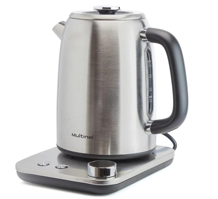 Начну с модели, которая понравилась продуманной конструкцией и удобством использования. Это электрочайник Hot Pot Plus от бренда Multinel. И если говорить непосредственно про использование, то есть несколько моментов, на которые стоит обратить внимание: широкое горлышко, полностью съемная крышка, корпус из нержавеющей стали. В такой чайник проще заливать воду, чем в модели с узким горлышком, а съемная крышка позволяет без проблем помыть внутренний объем. Крышка, кстати, тоже из нержавеющей стали, а не пластиковая. Есть шкала с уровнем воды — удобно следить за уровнем воды, не открывая крышку. Но основное удобство — в функции регулировки и поддержания температуры. Чайник позволяет выбрать один из предустановленных режимов или с помощью поворотной ручки выбрать любую температуру с точностью до 1 градуса. Такой чайник удобно хранить — шнур полностью помещается в отсеке на дне подставки.