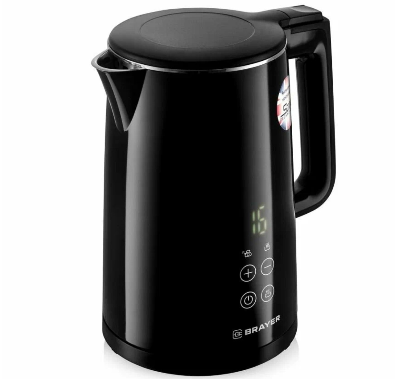 Вариант от BRAYER мне понравился своей возможностью установки температуры непосредственно с корпуса самого электрочайника. Есть возможность установить температуру в широком диапазоне: от 40 градусов до 100 градусов с шагом 10 градусов, в том числе и включить поддержание заданного значения. Обратите внимание на конструктив данного электрочайника — внутри колба из нержавеющей стали, а сверху — покрытие из специального матового пластика Cool Touch. Такая комбинация излишне не нагревается и о корпус чайника не получится обжечься.