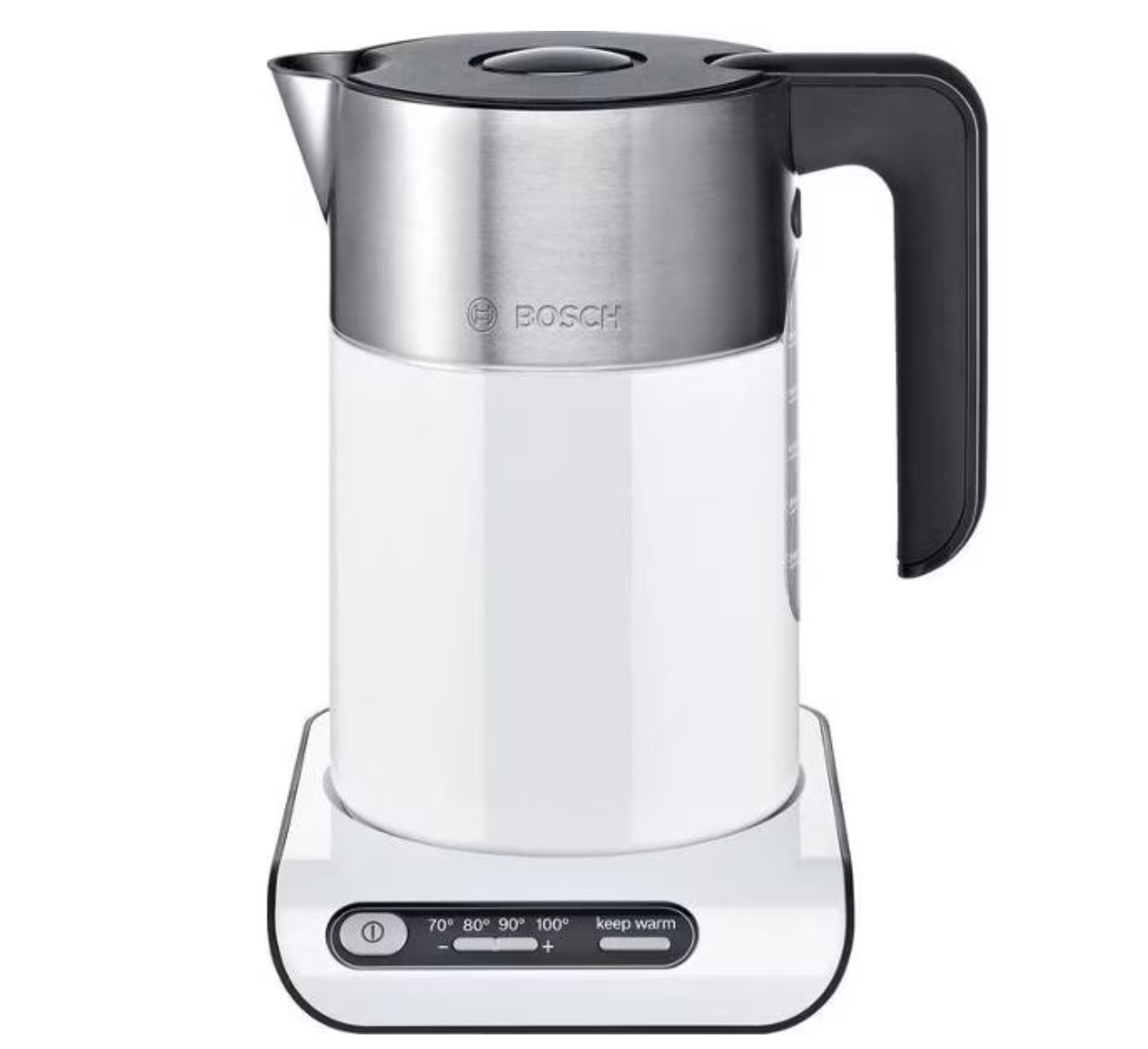 Бренд Bosch тоже не стоит на месте и в свое время выпустил модель электрочайника с подставкой и регулировкой температуры. Речь идет про TWK8611P — комбинированный чайник из нержавеющей стали и термостойкого пластика. Подставка выполнена из пластика с верхней панелью под нержавеющую сталь. Предусмотрены клавиши для регулировки и выбора температуры, а также ряд индикаторов. Предусмотрено четыре режима подогрева. Чайник имеет минималистичный дизайн, но при этом оснащается мощным нагревателем — закипает быстро.