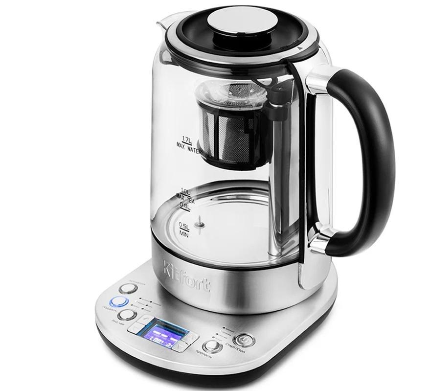 Если вы любите современные устройства, то обратите свое внимание на модель электрочайника КТ-6116 от бренда Kitfort. Сразу в глаза бросается специальная подставка со встроенным управлением — для этого чайника можно задать температуру подогрева. Встроенный терморегулятор дает возможность установить от 40 до 100 градусов. Обратите внимание на ситечко в комплекте — в данном электрочайнике можно заваривать травяные чаи, требующие низкой температуры. На дисплее можно указать время заваривания согласно рекомендациям. Отмечу материалы, из которых изготовлен чайник — это нержавеющая сталь и закаленное стекло.