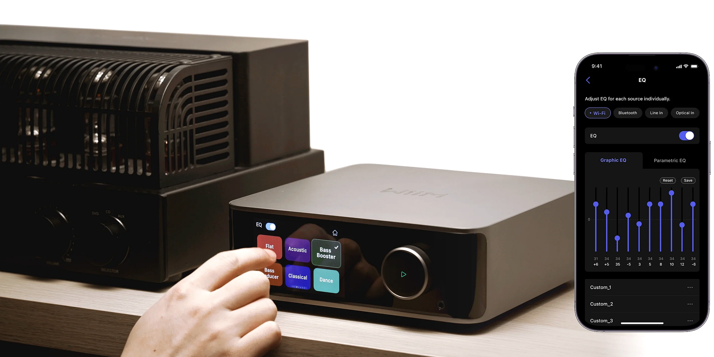 Аппаратная часть: ЦАП на паре ES9038Q2M, Bluetooth 5.4 с SoC QCC3084, для носителей файлов USB порт. Есть COAX вход и выход сигнала, оптический выход, подключение к ПК 32 бит 384 кГц.