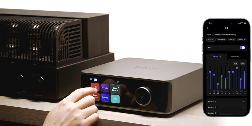 Размеры корпуса всего 210х200х72 мм, есть цветной дисплей для обложек альбомов и наглядных настроек. Есть пульт и 10-ти полосной эквалайзер в приложении.