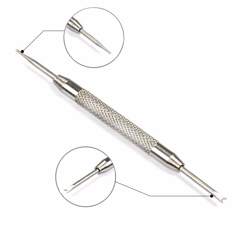 Бюджетный и простенький инструмент. Его нередко кладут как дополнение к ремешкам среднего ценового сегмента. На одном конце лопатка с углублением, что-то по мотивам «ласточкиного хвоста». С ее помощью легко отжимается «шпилька» между ушками часов. На другом конце тонкий стрежень. С его помощью можно отрегулировать длину браслета в районе застежки. Теоретически можно выдавливать штифты в звеньях и укорачивать браслет. Но скорее всего, это будет сделать трудновато и советую на эту функцию не рассчитывать.